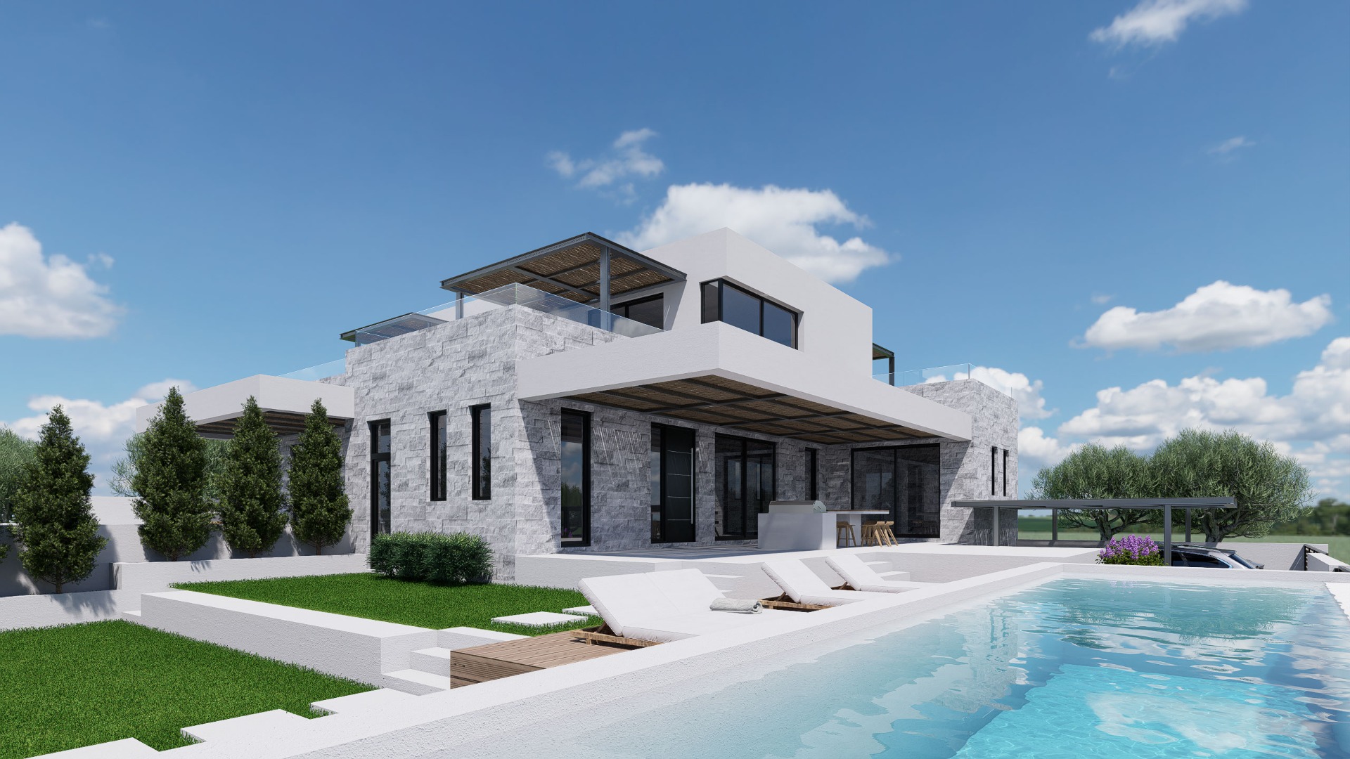 This project is located in the area of Palaiochora, in the Chania region. The purpose of this study was to create two residences: one for the owners' use and a smaller one for rental. Both homes would have sufficient outdoor space and coexist harmoniously. They were designed to fully utilize the plot area and take advantage of the surrounding views while maintaining the privacy of each home.